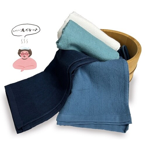 お風呂での一連の動作を1枚でこなせる「温泉州タオル」です。 背中も洗いやすく、頭にもしっかり巻ける安心のサイズです。 |