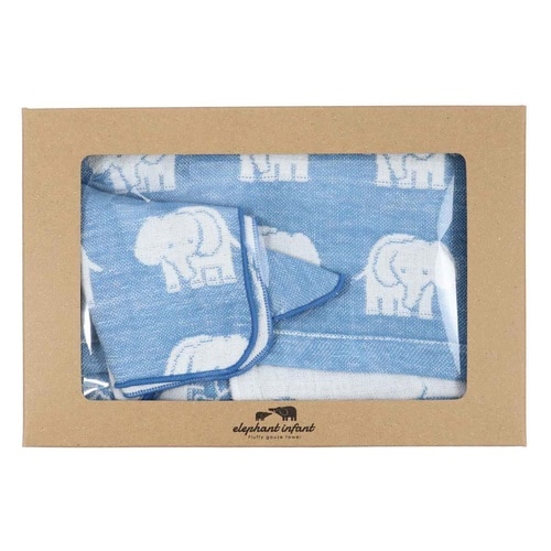 安心・安全の日本の技術で織った、ふんわり柔らかな「エレファントインファイト」シリーズのギフトセットです。 フード付きバスタオルとハンカチがセットになっています。 |