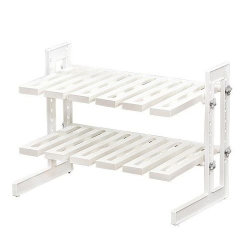 12枚の棚板が取り外せて、シンク下の排水トラップを避けて設置できるラックです。 設置場所に合わせて、棚の高さが3cm刻みで10段階に調節できます。 幅が50から75cmまで伸縮します。 |