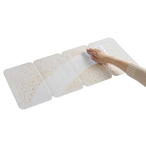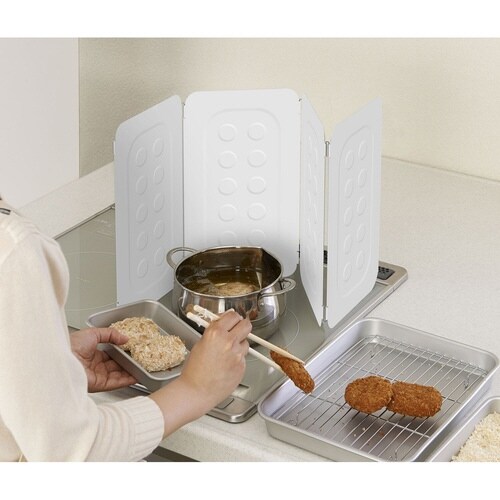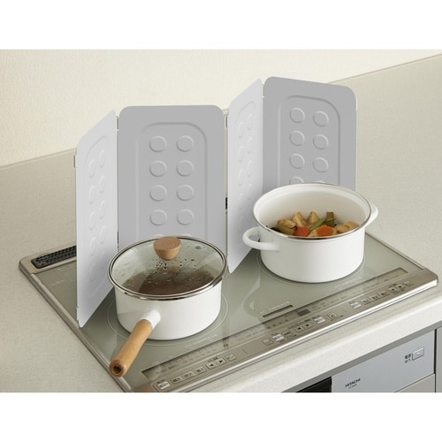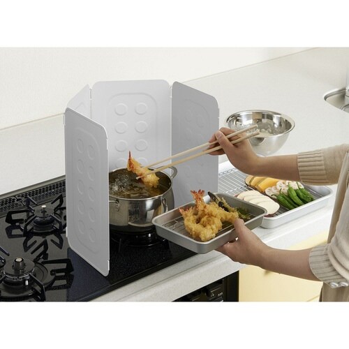 水拭きだけで油汚れが落ちるから、繰り返し使えて経済的なレンジガードです。 4枚パネルなので、作業に合わせて使いやすく形を変えられます。 使わない時は、折りたためば隙間に収納できます。 |