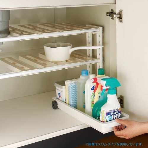トイレや洗濯機横、洗面台下までといろんな場所で活躍します。 トイレットペーパーなどのトイレ用品をまとめて収納します。 トレーは大型の車輪付きなのでスムーズに引き出せます。 |