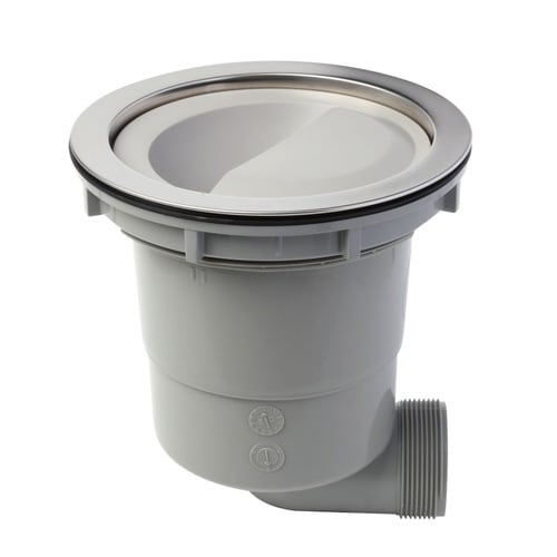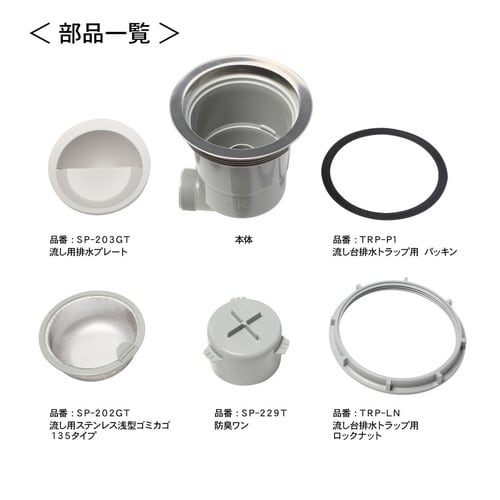 本体・ロックナット・ゴムパッキン・排水プレート・ステンレス製浅型ゴミカゴ・防臭ワンがセットになった、横向き用排水トラップセットです。 外径約18cmの排水口に取り付けられます。 |