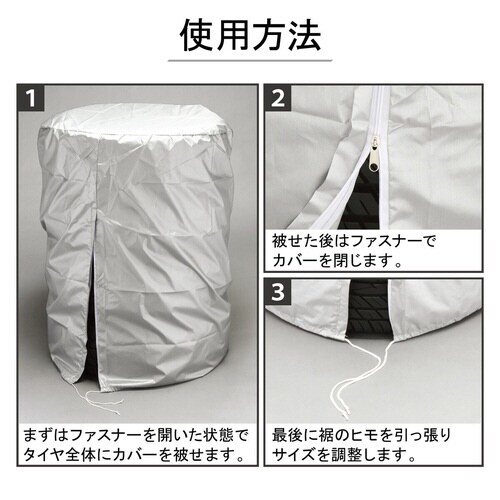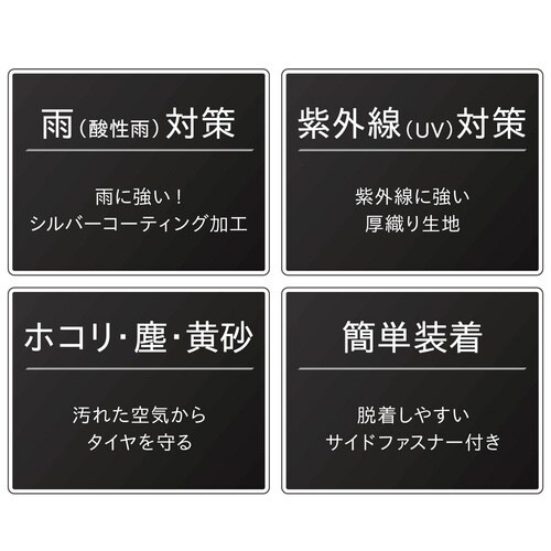 スタッドレスタイヤやスペアタイヤの保管に欠かせないタイヤカバーです。 ホコリ、塵、黄砂、汚れた空気からタイヤを守ります。 13から15インチのタイヤ4本用です。 |