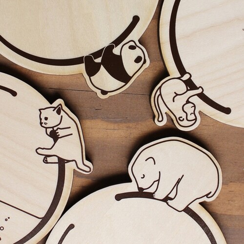 コップを置いてもデザインが隠れず、動物の姿が見えるコースターです。 飲み物を置く位置にそれぞれの動物の気になる物が描かれています。 1つずつ異なる木目をしている世界に1つだけのコースターです。 |
