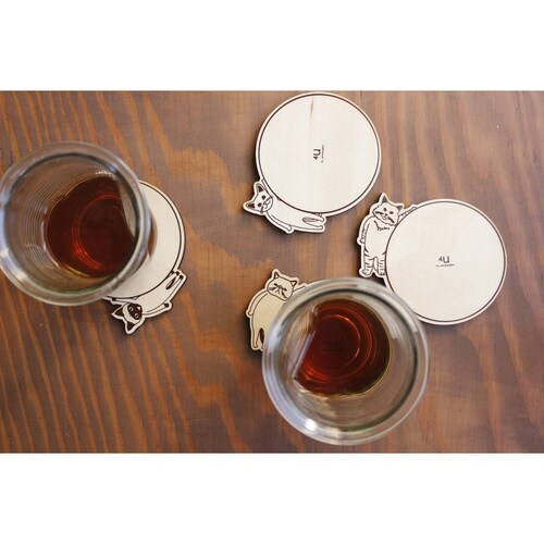 コップを置いてもデザインが隠れないコースターです。 個性的なネコがコップの横に寄り添います。 1つずつ異なる木目をしている世界に1つだけのコースターです。 |