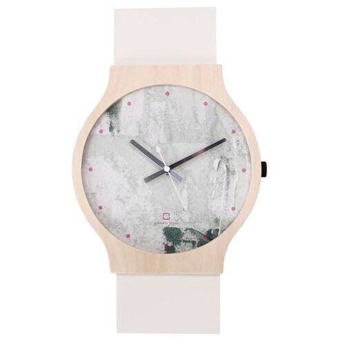 腕時計の様なデザインの壁掛け時計です。 数字を施していないデザイン性の高い文字板です。 漆器のトレーや菓子皿などに使われる、布張りの板に抽象的な配色が特徴的です。 |