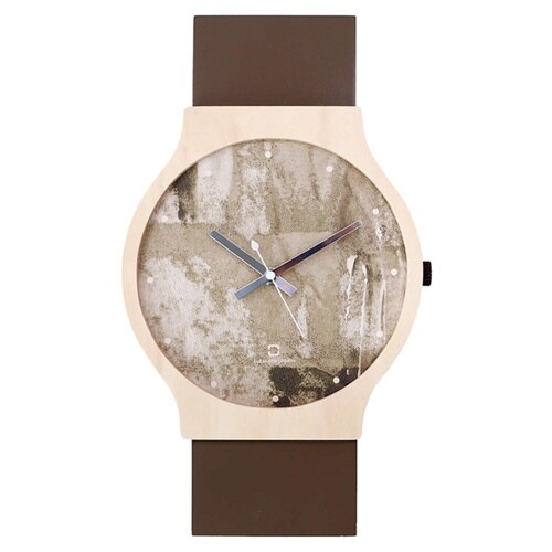 腕時計の様なデザインの壁掛け時計です。 数字を施していないデザイン性の高い文字板です。 漆器のトレーや菓子皿などに使われる、布張りの板に抽象的な配色が特徴的です。 |