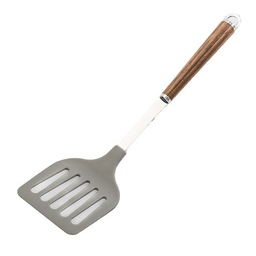 日本製の確かな品質と機能性や作業性を追求したナイロンターナーです。 ヘッド部分はナイロンなので、フライパンを傷つけにくいです。 柄に使われているのは天然のウォールナット材です。 |