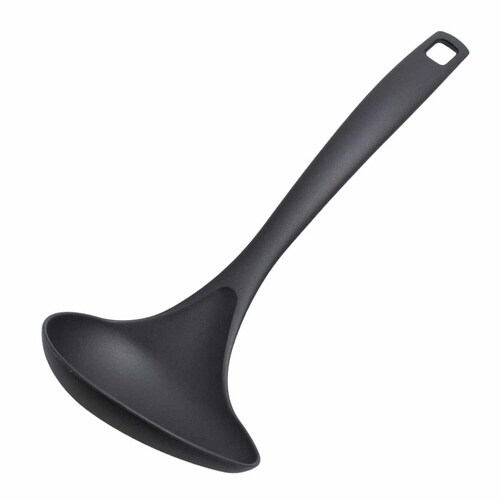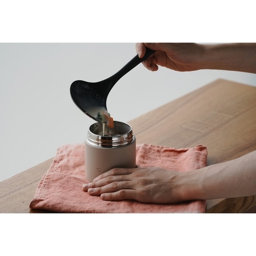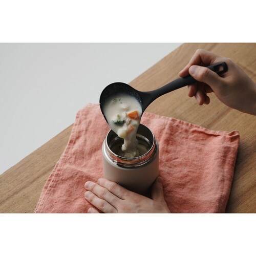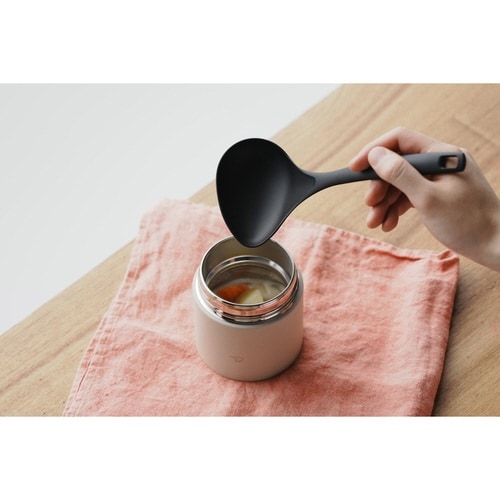 お弁当用に温かいスープを持ち運べるスープジャーにちょうどいいミニサイズの横口レードルです。 耐熱性に優れたグラスファイバー入りのナイロン樹脂製ツールで、鍋やフライパンの樹脂塗膜を傷つけにくいです。 |