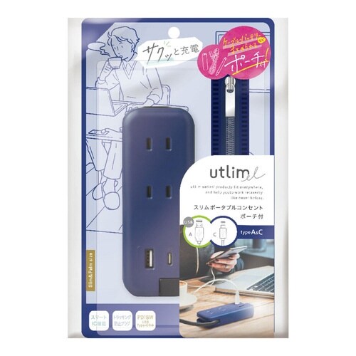 コンセント タップ スリムポータブルコンセント USB‐C USB‐A ユートリムエル ポーチ付 ネイビー