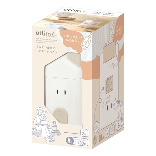 コンセント えんとつ屋根のコンセントハウス 2m AC 6個口 USBポート付き 同時充電 ホワイト