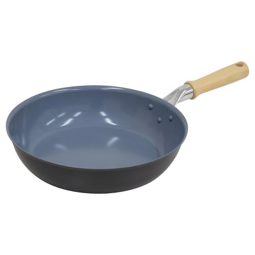 ガス火専用フライパン 26cmです。 加熱しても有害物質が出にくい日本製のセラミック加工が施されています。 フッ素加工と同様、こびりつきにくく、汚れがツルっと落ちやすいです。 |