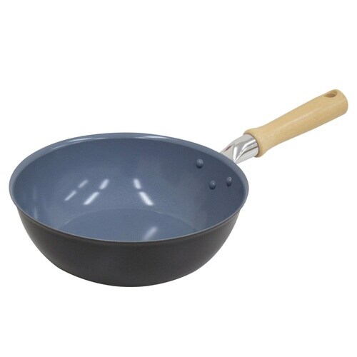 ガス火専用ディープパン 22cmです。 加熱しても有害物質が出にくい日本製のセラミック加工が施されています。 フッ素加工と同様、こびりつきにくく、汚れがツルっと落ちやすいです。 |