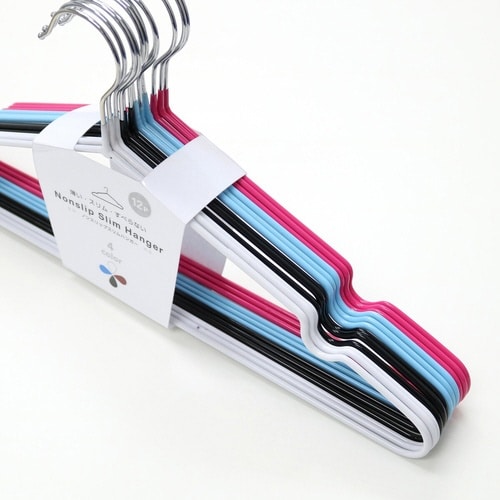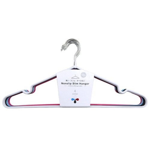 衣類が滑りにくいノンスリップスリムハンガー12本セットです。 かさばらずに収納できます。 ホワイト、ブラック、ブルー、レッドの4色×3本セットです。 |
