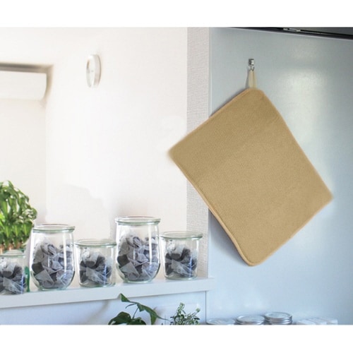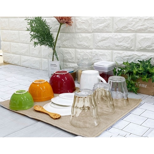 マイクロファイバーで素早く吸水する水切りマットです。 クッション性があるので、食器を置くときの衝撃が和らぎます。 使い勝手の良いサイズで約2人分の食器を置くことができます。 |