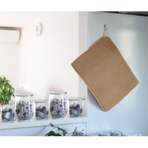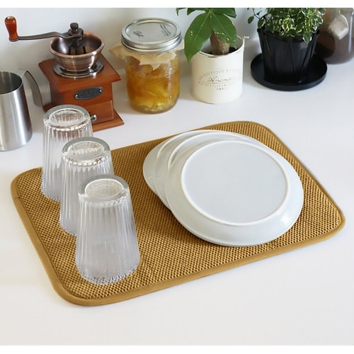 マイクロファイバーで素早く吸水する水切りマットです。 クッション性があるので、食器を置くときの衝撃が和らぎます。 使い勝手の良いサイズで約2人分の食器を置くことができます。 |