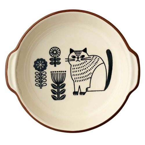 オーブン調理にレンジでの温め、食器としても使える丸型のグラタン皿です。 安心安全の日本製で熱に強い萬古焼きでできています。 可愛い猫とおしゃれな植物の絵柄です。 |