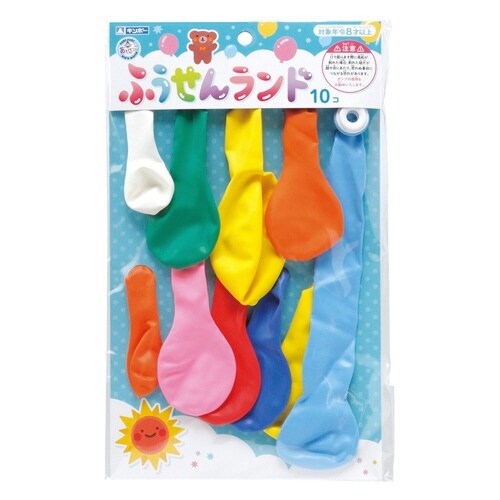 アソート10個入りのふうせんセットです。 いろんな種類のふうせんが勢ぞろいしました。 ロケットふうせん1個、大きさいろいろのゴムふうせん9個が入っています。 |