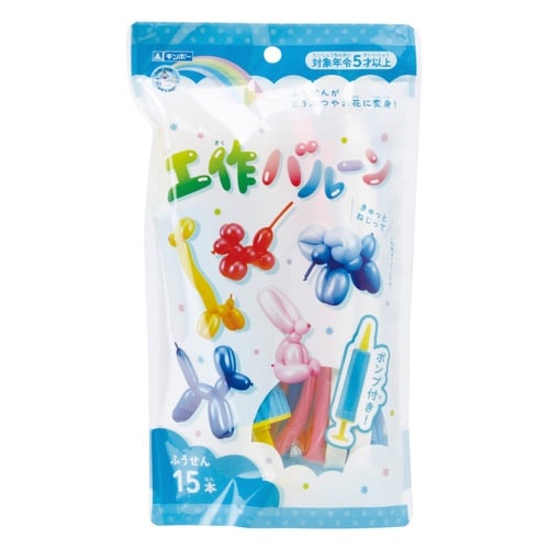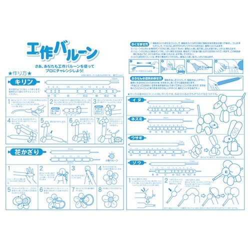 ふうせんを使って動物やお花が簡単に作れる工作バルーンです。 付属の説明書には6種類の作り方が紹介されてるのでお子様でも簡単に作れます。 ポンプ付きなので長いふうせんを膨らませるのも楽ちんです。 |