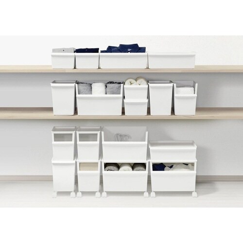 ワイド深型2個と専用フタ、キャスターがまとまった使い勝手のよいセットです。 「見せる」と「隠す」を切り替えできます。 抜群の収納力ながらすっきりした見た目です。 投げ込むだけでカンタン収納できます。 |