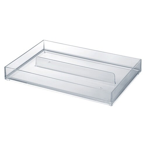 自由なスタッキングで自分だけの収納空間が作れるシステムトレーです。 様々なサイズとの組み合わせができます。 文具や食器などの収納に便利な2分割Lサイズです。 |