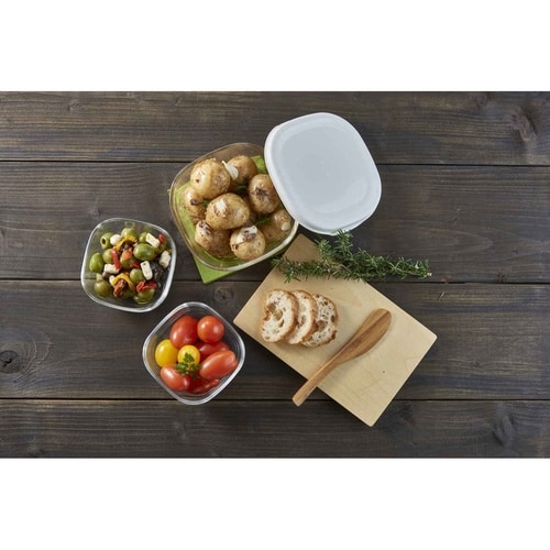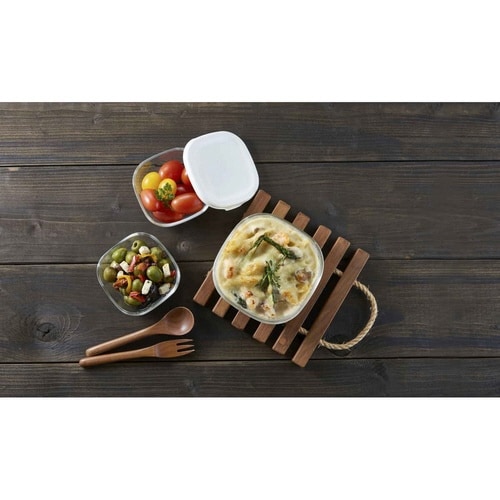 色と匂いがつきにくい耐熱ガラス製角型保存容器 3個入り(250ml×2個・600ml×1個) 電子レンジ・オーブン使用可能 食器として食卓へ 天然鉱物から作られる耐熱ガラス 入れ子でコンパクト収納 |