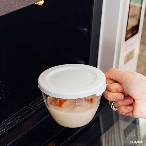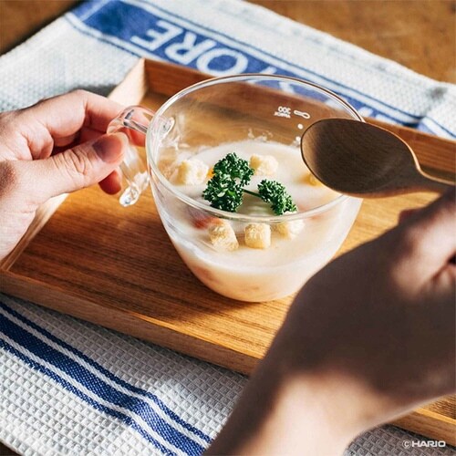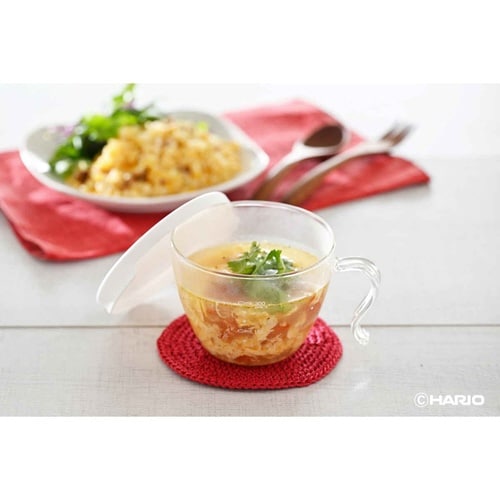 電子レンジで簡単にひとり分のスープが作れます。 カップは色やニオイがつきにくい耐熱ガラス製です。 ちょっと一品ほしいときに、電子レンジで調理してそのまま食卓へ並べられます。 |