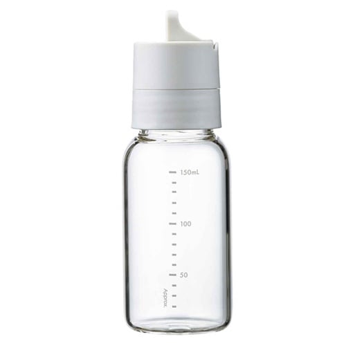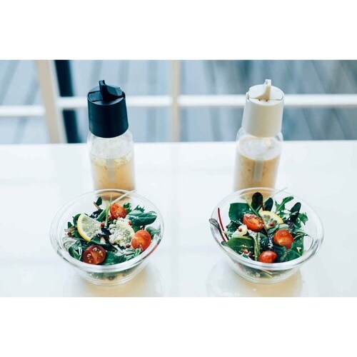 片手で開閉できるドレッシングボトル150mlです。 密封性が高いので、材料を入れて振ればドレッシングが作れます。 本体ボトルは、色やニオイがつきにくい耐熱ガラス製です。 |