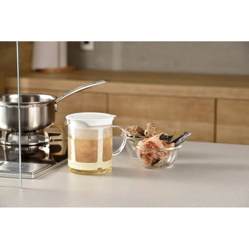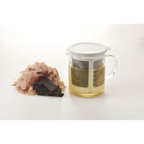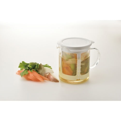 レンジで手軽に豊かな風味のおだしが作れます。 ストレーナーを傾けて最後まで無駄なくだしを抽出します。 ポットの底まで届く大きなストレーナーで、少量でもしっかり抽出します。 |