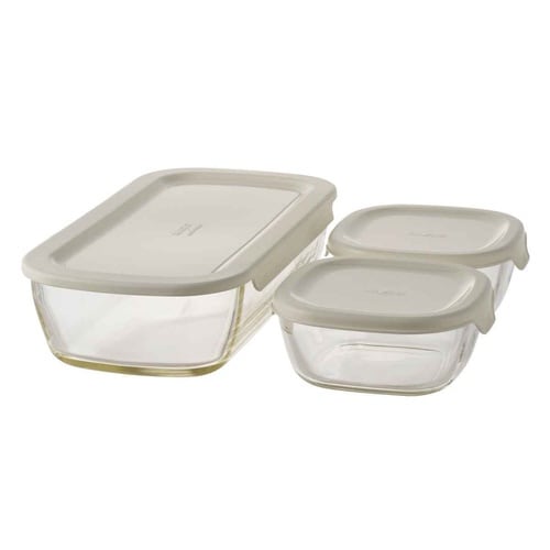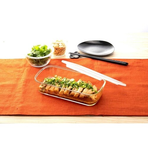 色と匂いがつきにくい耐熱ガラス製角型コンテナ 3個入り (250ml×2個/900ml×1個) オーブン使用可能 フタをしたまま電子レンジ使用可能 食器として食卓へ 天然鉱物から作られる耐熱ガラス |