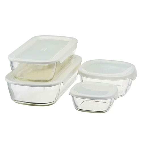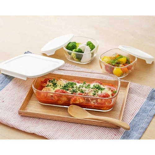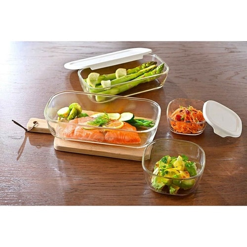 色と匂いがつきにくい耐熱ガラス製角型コンテナ 4個入り (250ml×1個/600ml×1個/900ml×1個/1.4L×1個) オーブン使用可能 フタをしたまま電子レンジ使用可能 食器として食卓へ |