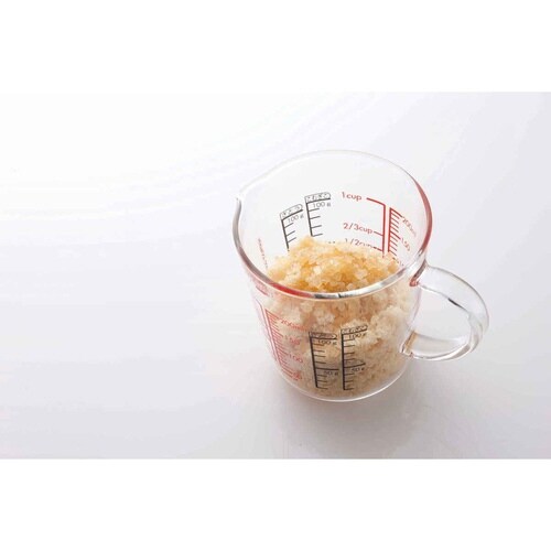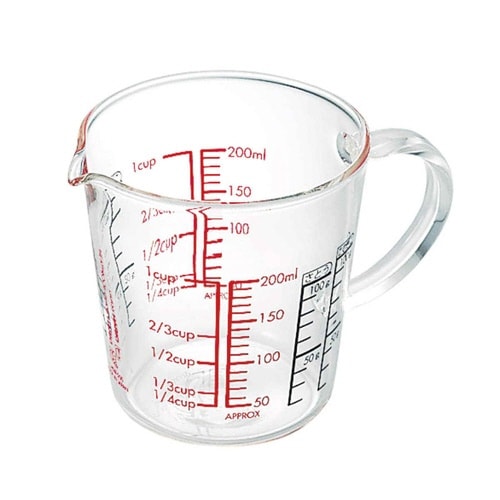 耐熱ガラス製で、電子レンジ、食洗機が使用できます。 外側から見た時用と内側から見た時用の目盛りが印字されています。 液体、粉を量る目盛りが付いています。 注ぎ口があるので液だれしにくいです。 |