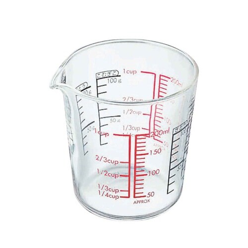 耐熱ガラス製で、電子レンジ、食洗機が使用できます。 外側から見た時用と内側から見た時用の目盛りが印字されています。 液体、粉を量る目盛りが付いています。 注ぎ口があるので液だれしにくいです。 |