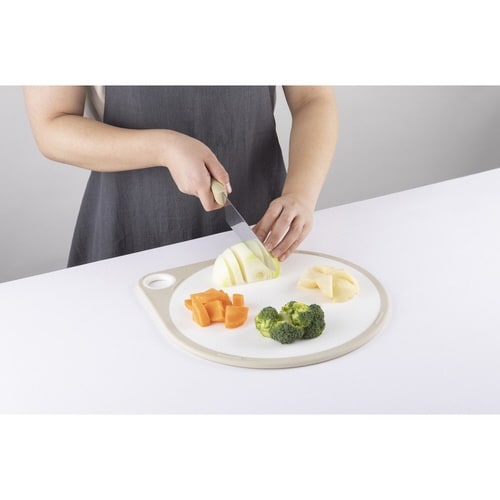 扱いやすい円形状のまな板 30cmです。 縁にすべり止め加工が施されているので、調理中にまな板がズレたり動いたりすることがなく安心です。 直線部分があるので転がらず、立てかけて乾かせます。