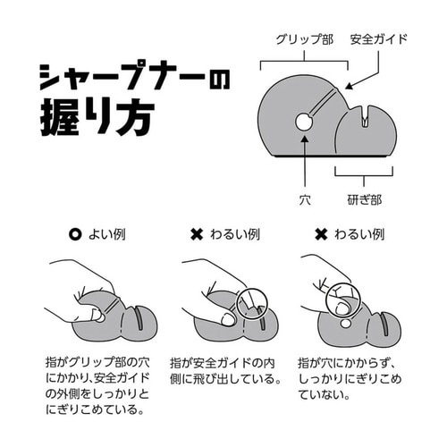 お子様が料理のお手伝いをするのがもっと楽しくなるリトルシェフクラブシリーズのシャープナーです。 子ども包丁本来の切れ味までよみがえります。 にぎる場所を示した安全ガイド付きです。 |