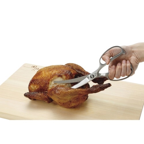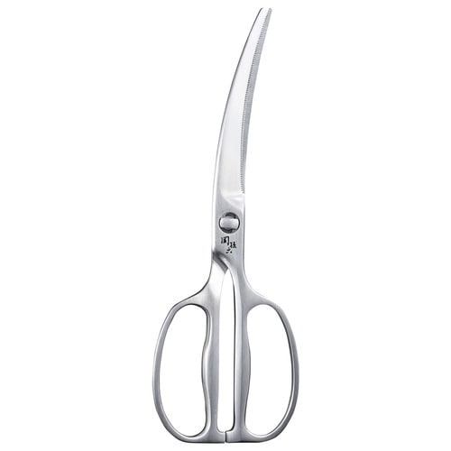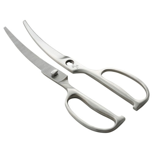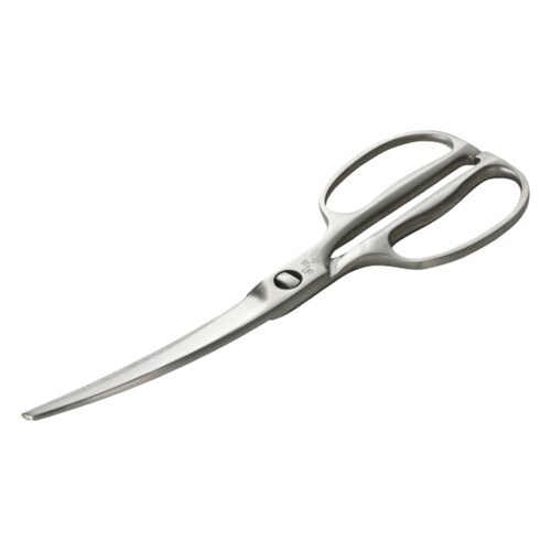 カーブした刃体形状とギザギザしたセレーション刃で食材をしっかりキャッチすることができるキッチンばさみです。 鍛造オールステンレス製なので丈夫でたわみにくく切るものを選ばない万能なアイテムです。 |