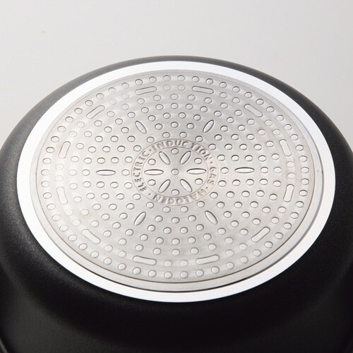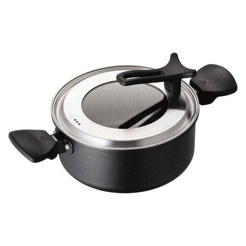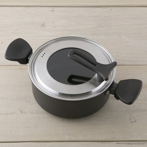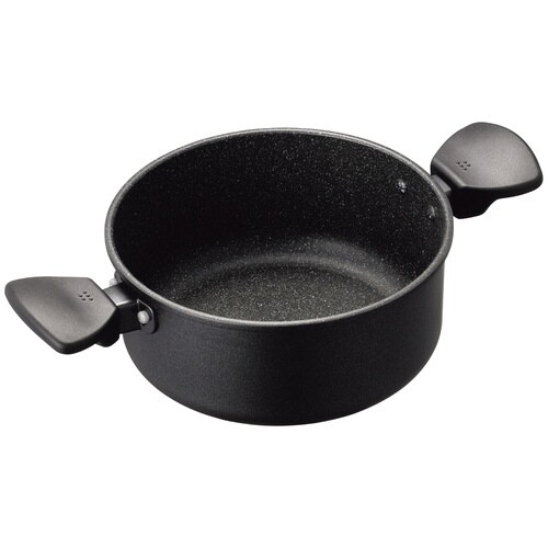 薄い側面で、軽量な両手鍋20cmです。 場所をとらない自立するガラス蓋が付属しています。 汚れに強いマーブルコートコーティングが施されています。 2.6mmの厚い底面なので、優れた保温性があります。 |