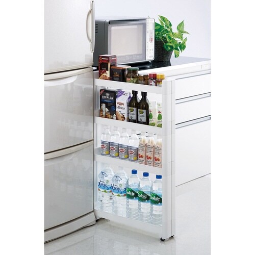 たった幅10.5cm!気になる隙間を有効活用できるキッチンワゴンです。 側面の板が目隠し代わりになります。 工具不要で組み立て簡単です。 高さの異なる落下防止ガードがついています。