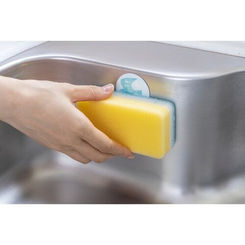 表面の目に見えない突起が繊維を引っ掛け、フックに早変わり。 裏面の粘着シートで壁やシンクにピタっと貼れます。 シンクに貼り付けると食器洗いスポンジを付けられます。 |