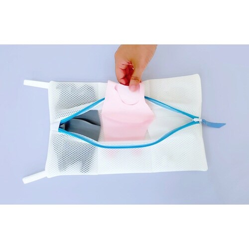 マスクを3枚まとめて洗える洗濯ネットです。 仕切り付きなので、ズレずに洗うことができます。 内側がダブルメッシュ素材なので、優しく洗うことができます。 |
