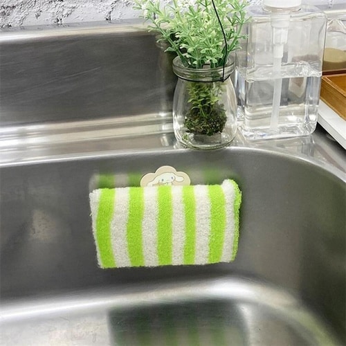 表面の目に見えない突起が繊維を引っ掛け、フックに早変わり。 裏面の粘着シートで壁やシンクにピタっと貼れます。 シンクに貼り付けると食器洗いスポンジを付けられます。 |
