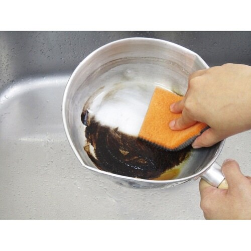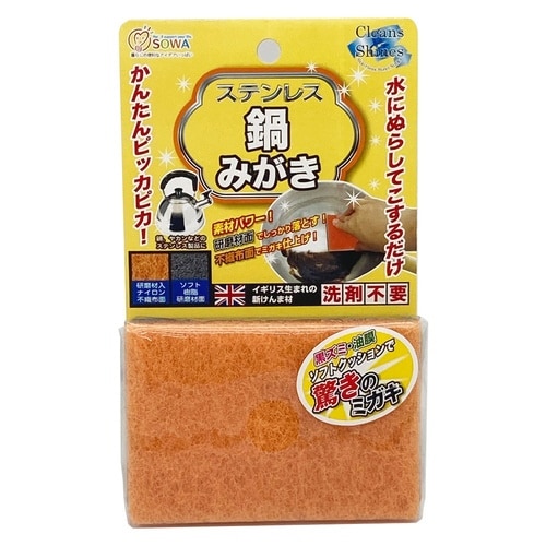 水に濡らしてこするだけでステンレス製品がピカピカになる鍋みがきです。 洗剤不要の研磨材入りで汚れをすっきり落します。 |