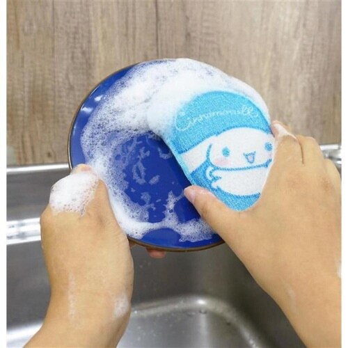 ポリエステルフィルムとパイルメッシュ素材の両面仕様で汚れがよく落ちるスポンジです。 可愛らしいシナモロールのスポンジです。 スポンジを壁面に貼って水切りができる便利なフック付きです。 |