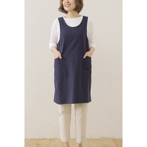 幅広の生地で肩から吊るすことでシルエットが美しい、クロスオーバータイプのエプロンです。 背中のクロスと広い身幅でお尻が隠れ、ワンピースのように着用することができます。 |