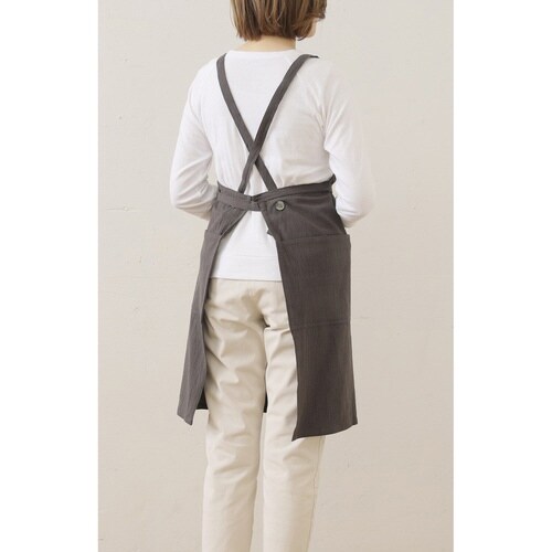 背中で肩ひもがクロスしているタイプのエプロンです。 主に腰の紐でエプロン自体を支え肩ひもに重さがかからないため、首掛けタイプに比べて着用時の疲れが軽減されます。 |