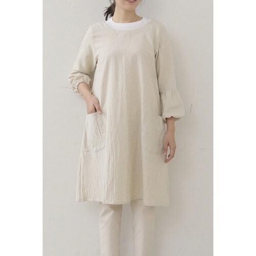 腰紐の着脱で2つのスタイルが楽しめて、ワンピースのようにカジュアルに着られるカッポウギです。 カッポウギは上半身から膝丈まで布で覆うので、袖口だけでなく服全体を汚れから守ってくれます。 |