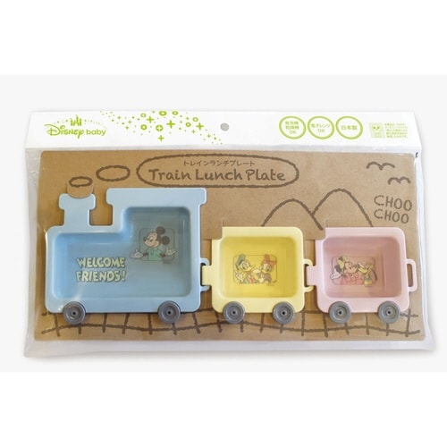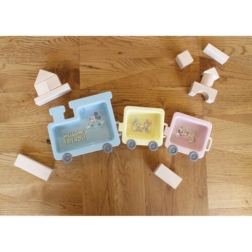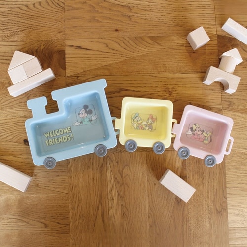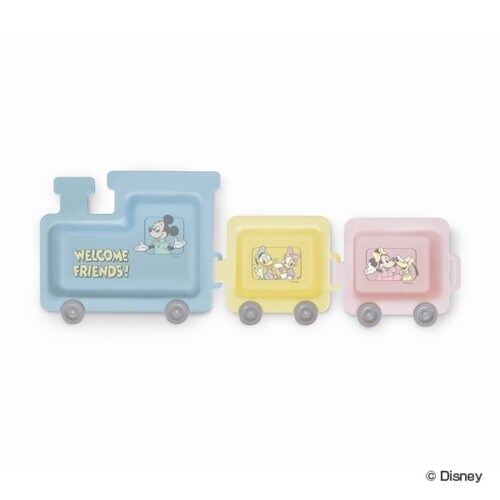 ミッキーマウスのイラストが可愛い汽車の形をしたランチプレートです。 プレートが連結できて、車輪パーツもクルクル回ります。 |