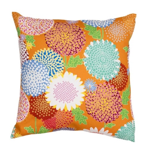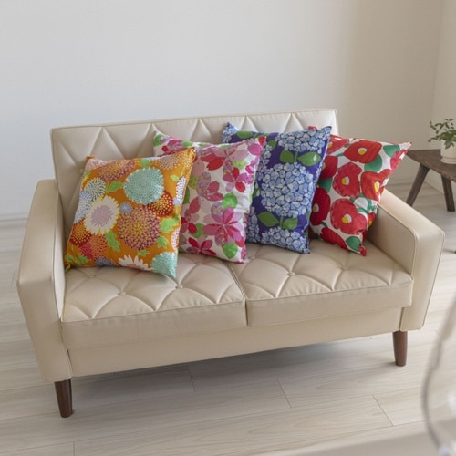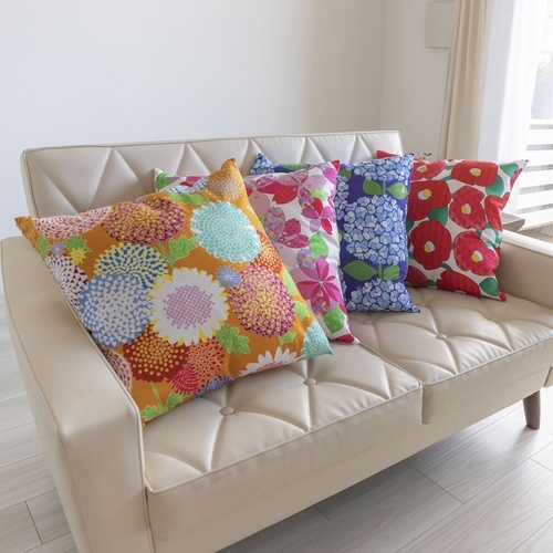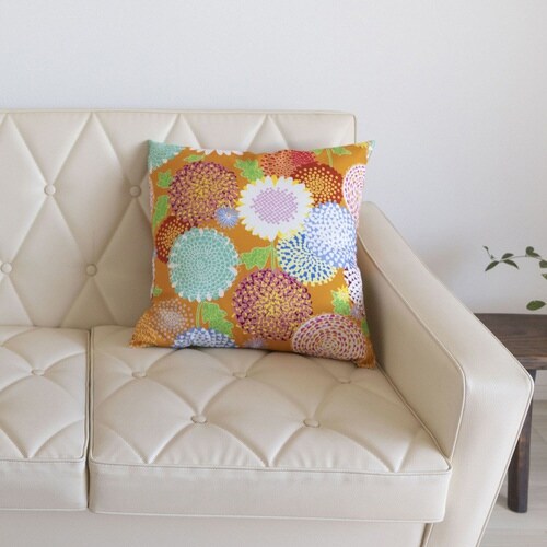京都の染工場がデザインした、華やかで古風な花柄のクッションカバーです。 鮮やかで美しい色彩がお部屋の印象を明るくさせます。 素材は丈夫な綿オックスを用いて、ファスナーはサイドについています。 |