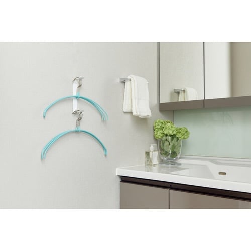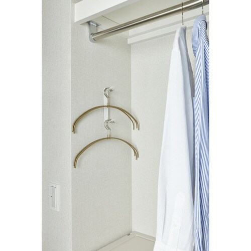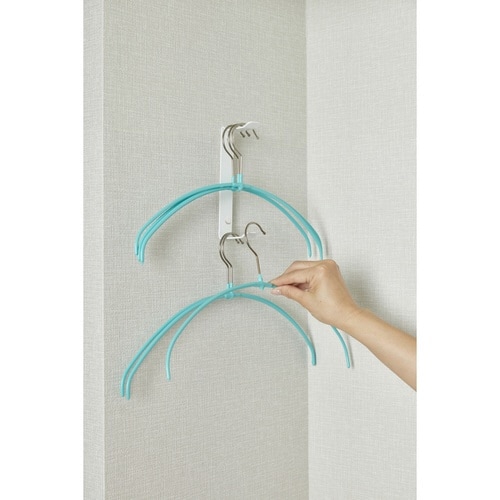 からみやすく、収納に困るノンスリップハンガーをすっきり収納できるフックです。 ブラックとホワイトの2色展開です。 フックの先端は上向き構造なので、ハンガーが落ちにくいです。 |