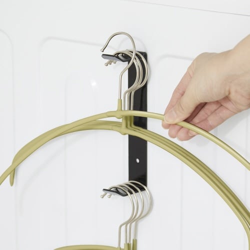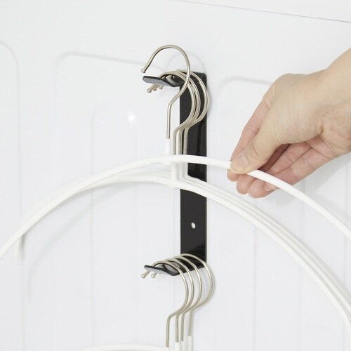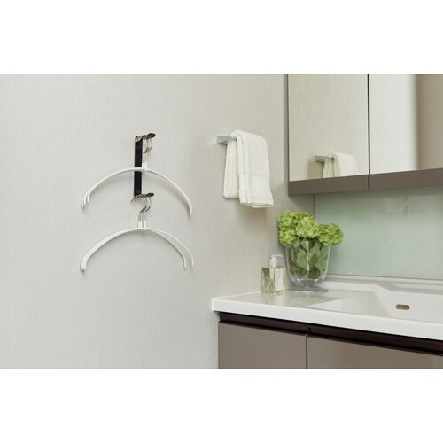 からみやすく、収納に困るノンスリップハンガーをすっきり収納できるフックです。 ブラックとホワイトの2色展開です。 フックの先端は上向き構造なので、ハンガーが落ちにくいです。 |